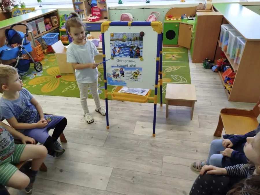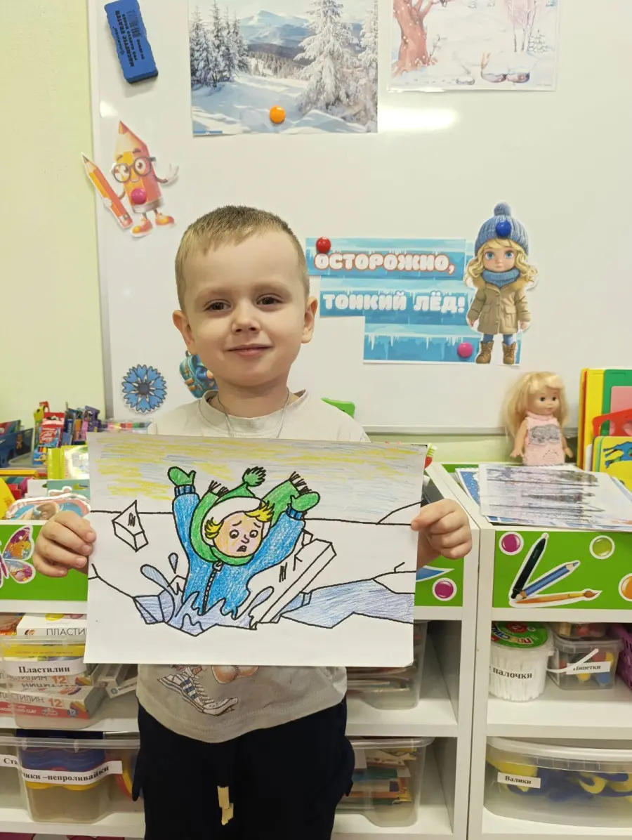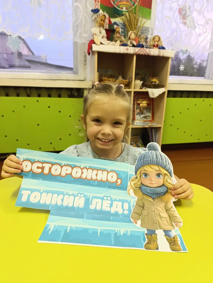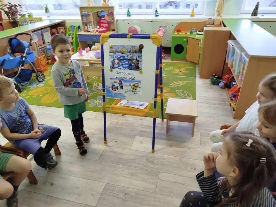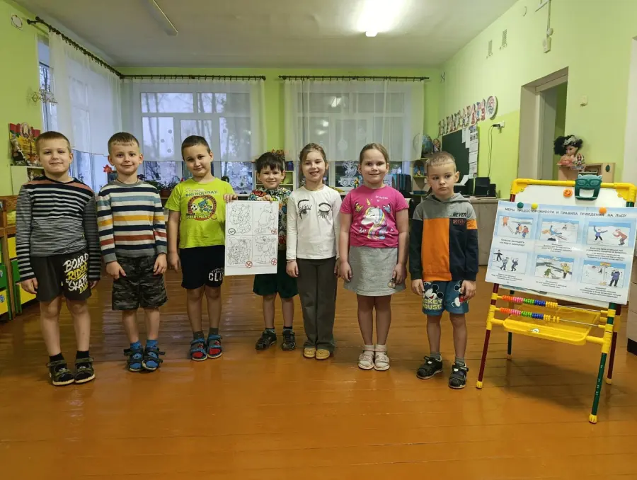 Старшие дошкольники с большим интересом включились в занятие «Правила безопасности зимой». В течение дня дети изучали предметы для спасения на воде (спасательный круг, жилет, веревка), обыгрывали ситуацию «Где можно покататься на коньках?», раскрашивали тематические раскраски и обсуждали плакаты: «Безопасная зима», «Осторожно! Зимняя дорога!» и «Осторожно! Тонкий лед на водоемах!». Итогом дня стал просмотр познавательного видеоролика «Тонкий лед опасен» и серии «Теплее, еще теплее» из «Азбуки безопасности».