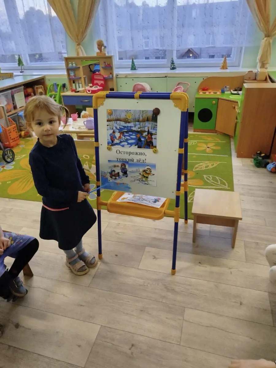 Воспитанники средней группы начали день с беседы «Зимние опасности». Они активно участвовали в обсуждении ситуационных иллюстраций, а завершился день просмотром и разбором серии «На тонком льду» из мультсериала Смешарики «Азбука безопасности».