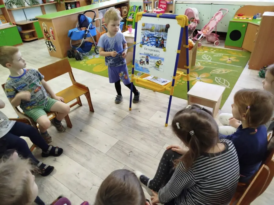 Для самых маленьких знакомство с правилами безопасности проходило в игровой форме. С воспитанниками младших групп провели беседы по наглядным картинкам «Осторожно, тонкий лед!» и организовали просмотр обучающего мультфильма «Волшебная книга» от МЧС, а также видеоролика «Игры на тонком льду».